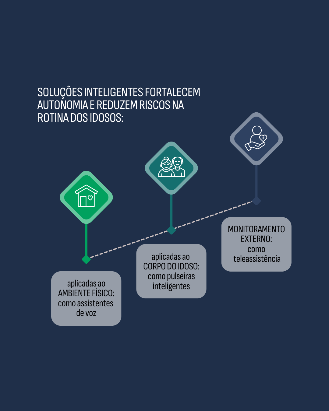 Entre as soluções já disponíveis, destacam-se os sensores de movimento e de quedas, que detectam alterações bruscas e enviam alertas automáticos; os sistemas de iluminação inteligente, que se ajustam à presença e aos horários do usuário; os assistentes de voz, que facilitam a comunicação e o controle do ambiente e as fechaduras digitais, que garantem segurança e acessos monitorados.